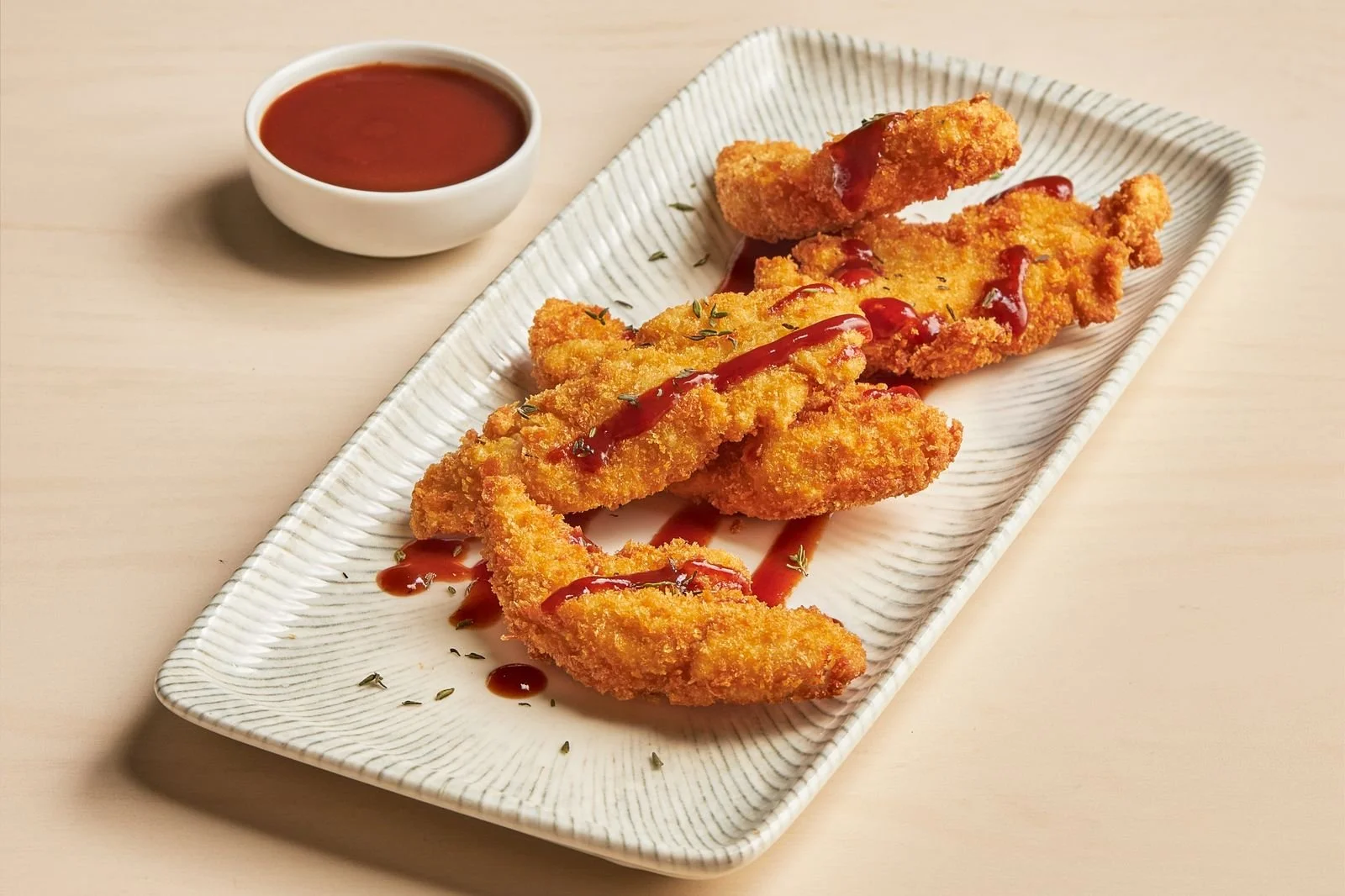 Crispy, breaded chicken tenders served with homemade sauce.