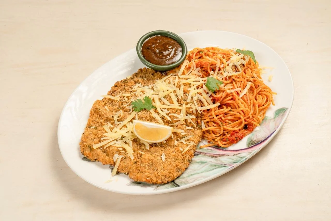 Pan fried breaded imported beef tenderloin with lemon and herbs served with tomato pasta and parmesan cheese.