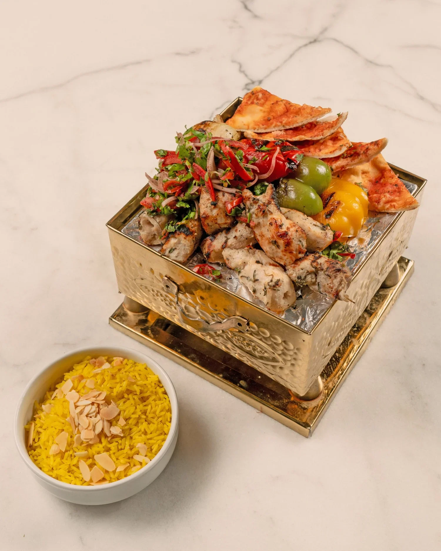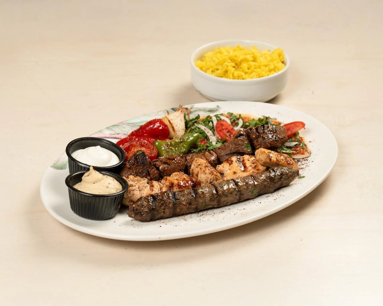 Grilled beef cubes, taouk and kafta skewers served with grilled veggies, bioise, hummus dip and oriental rice.