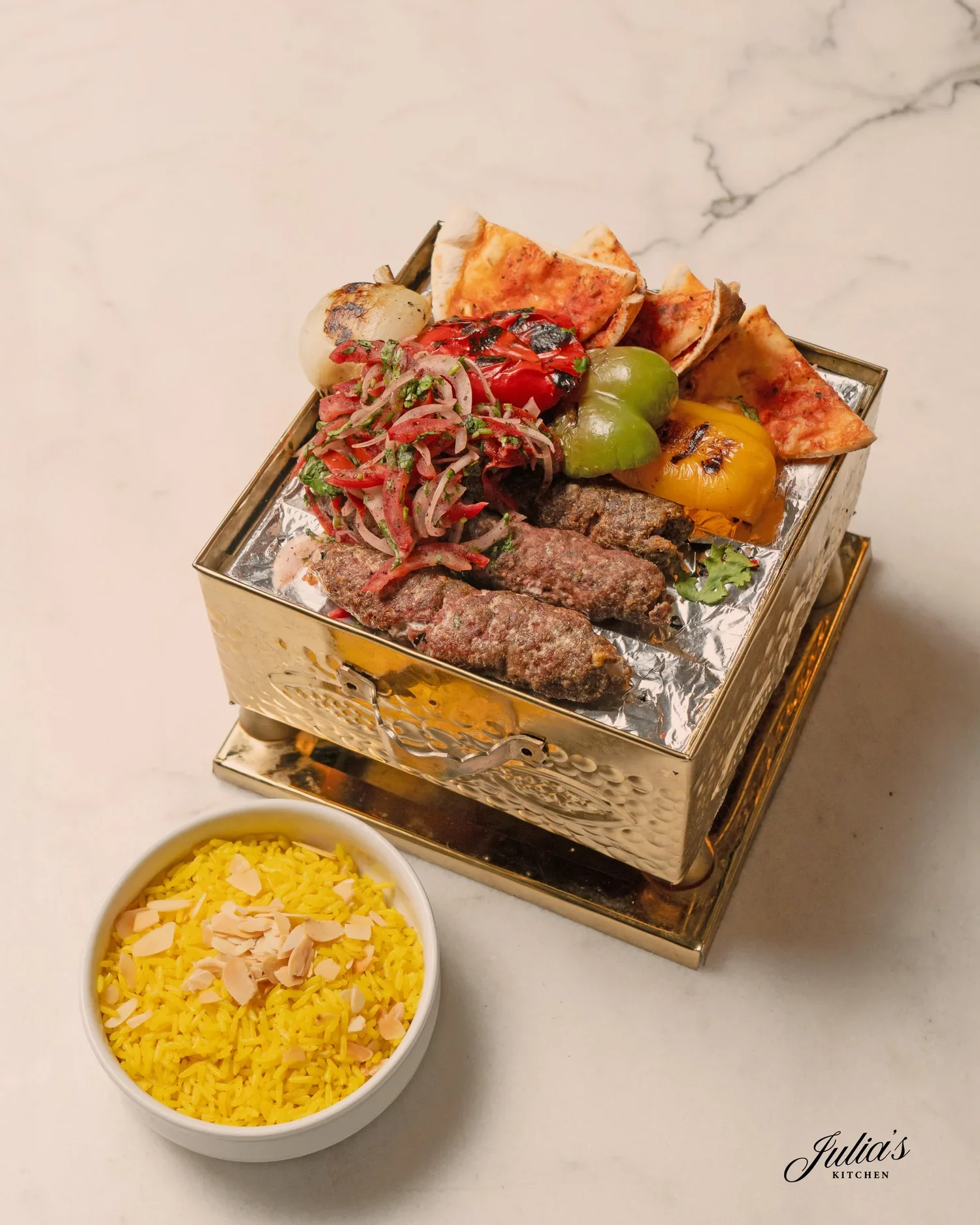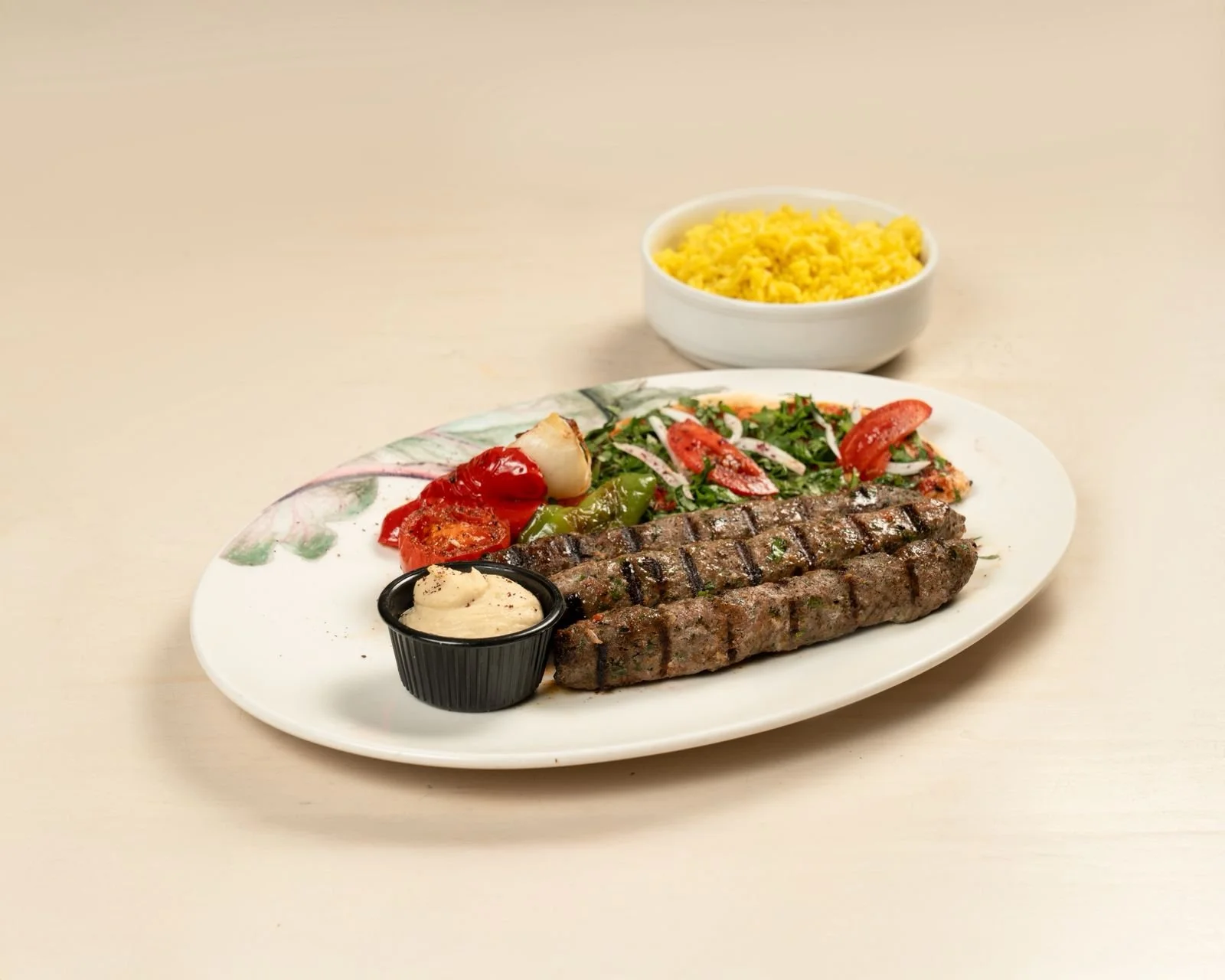 Grilled kafta skewers served with grilled veggies, bioise, hummus dip and oriental rice.