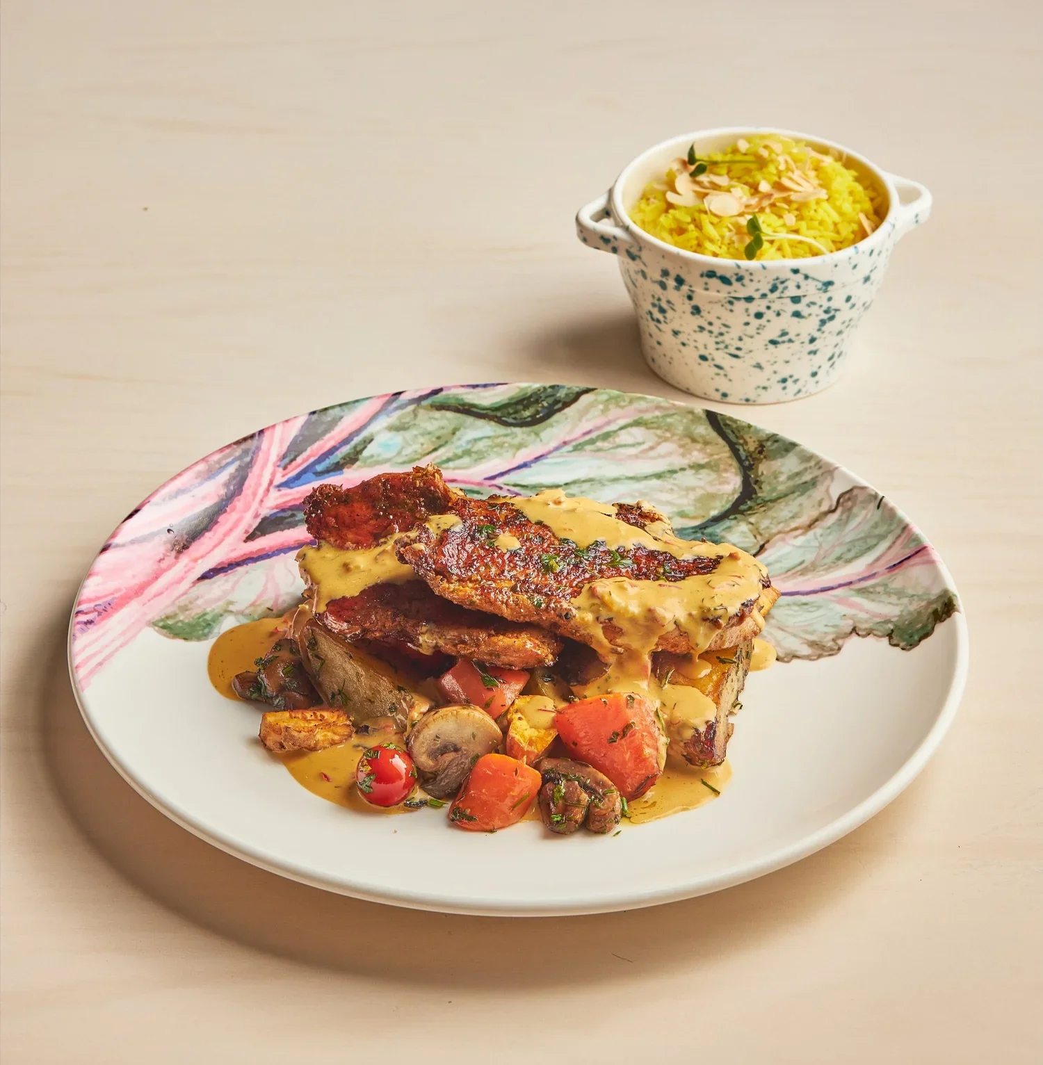 Grilled deboned half marinated chicken served with harissa sauce, sauteed sweet potatoes, seasonal veggies and oriental rice.