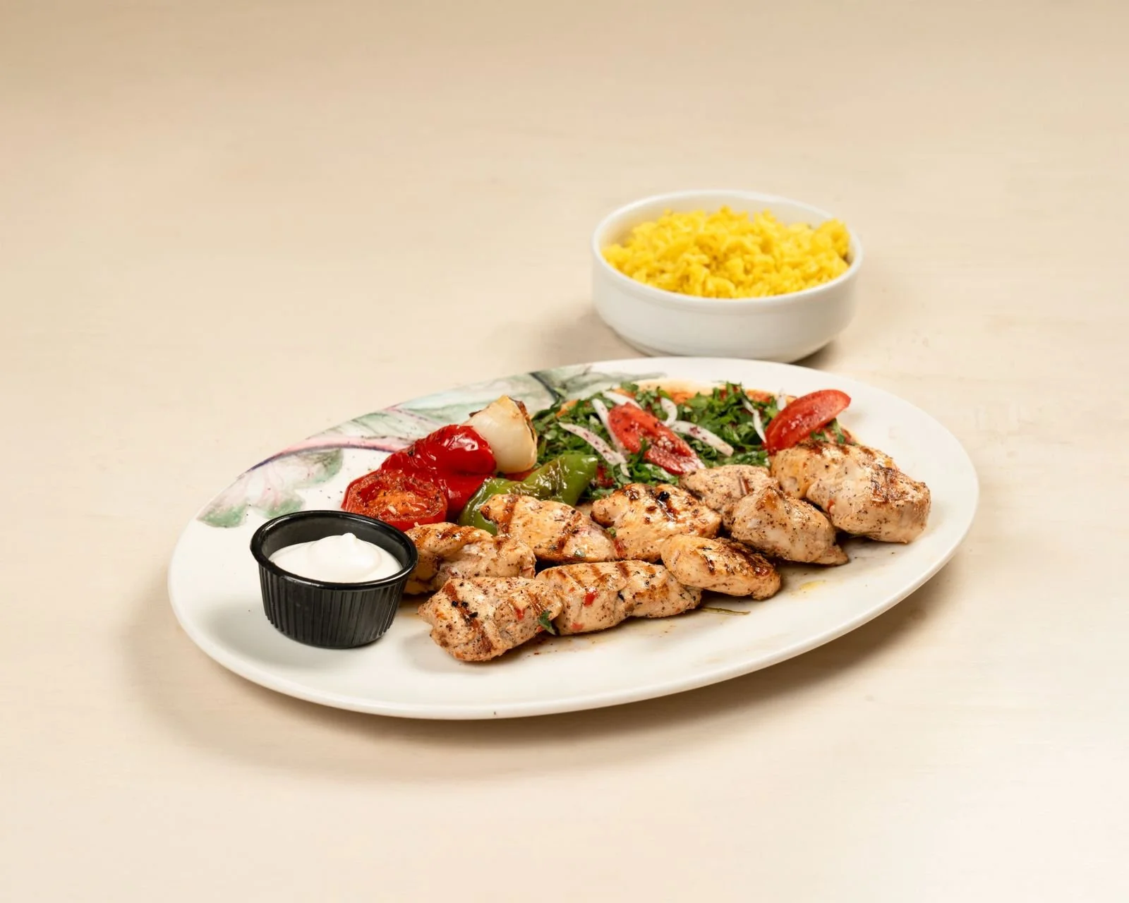 Grilled marinated chicken breast cubes served with grilled veggies, bioise, garlic dip and oriental rice.