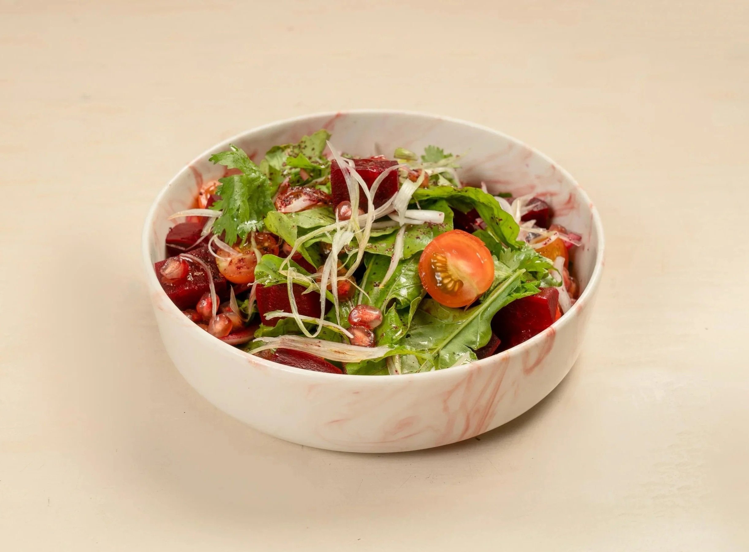 Beetroot cubes with onions sumac, fresh Rocca and tomatoes served with lemon mustard dressing.