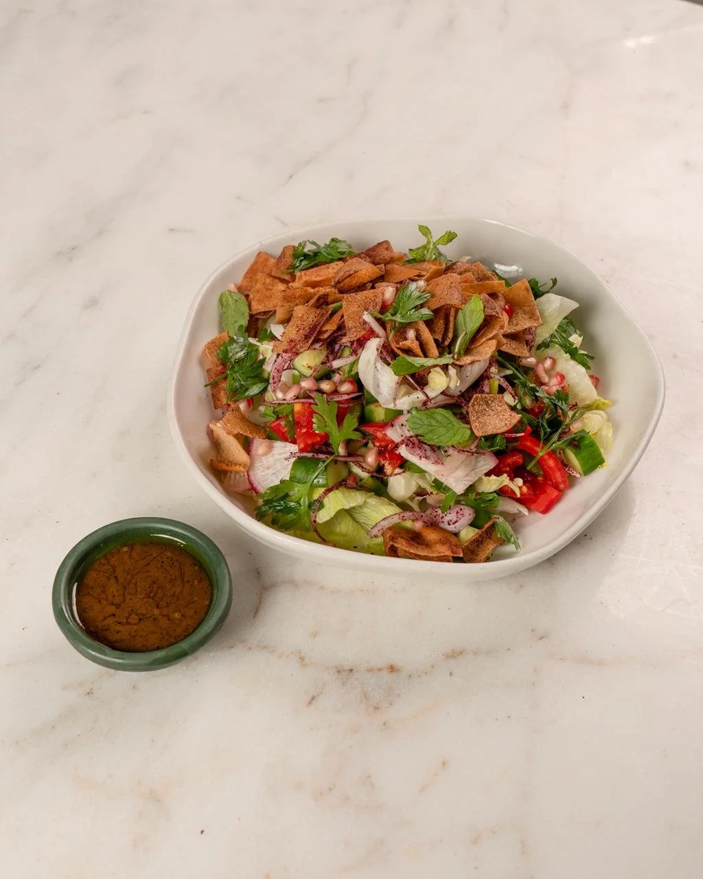 Classic vegetables with pomegranate molasses dressing, sumac and crispy bread.